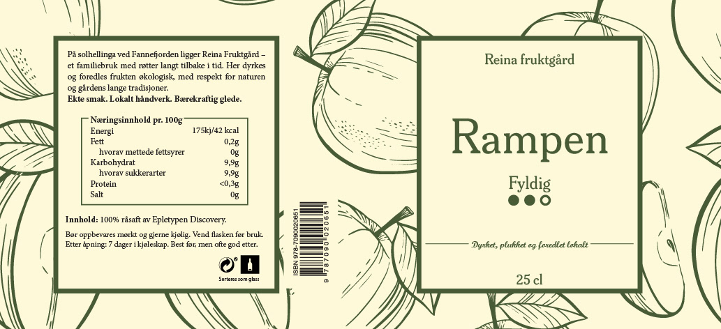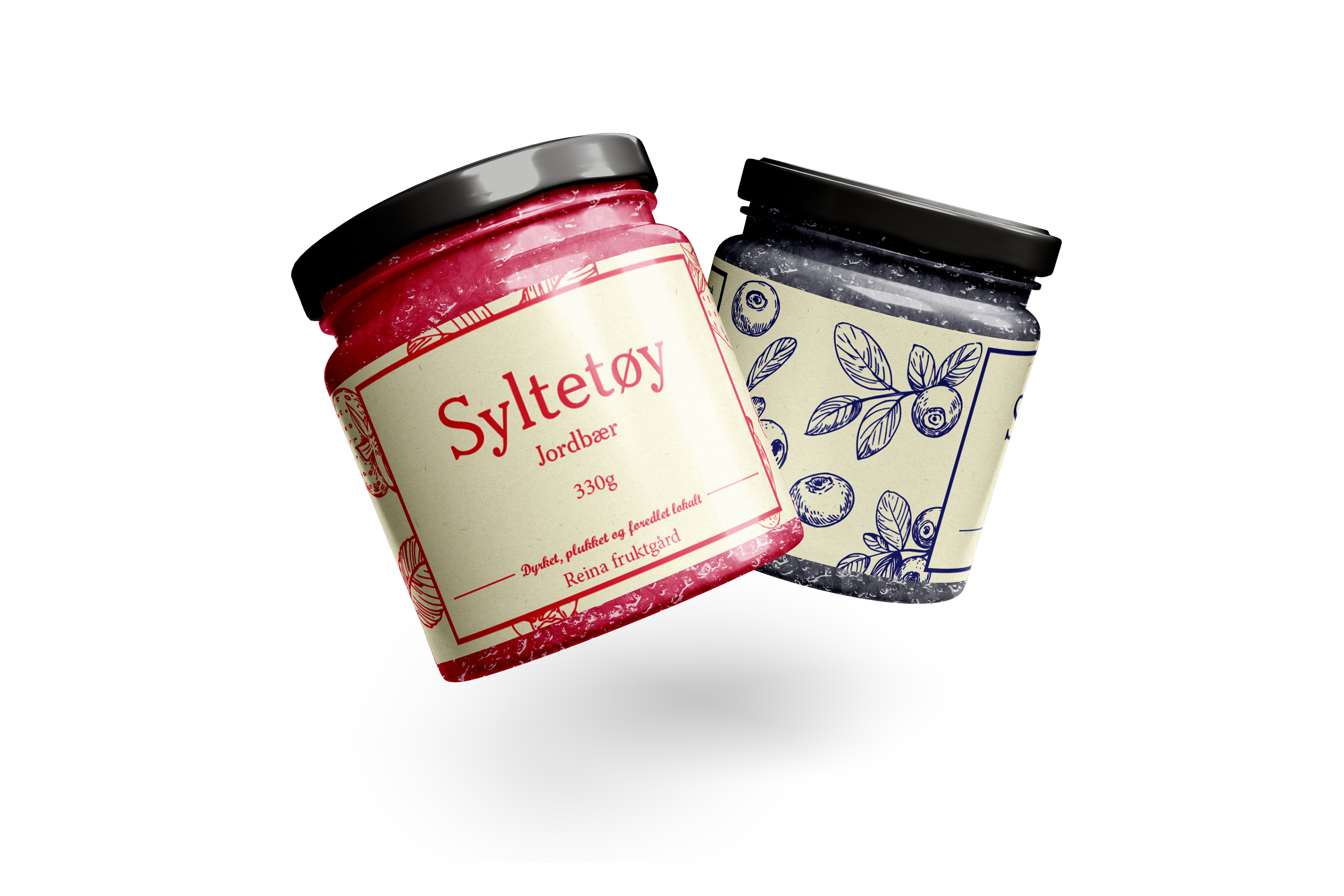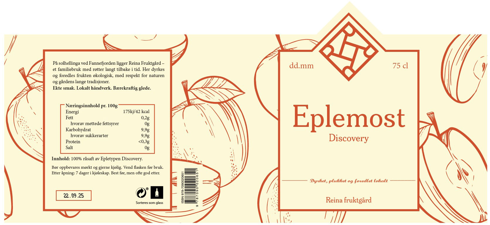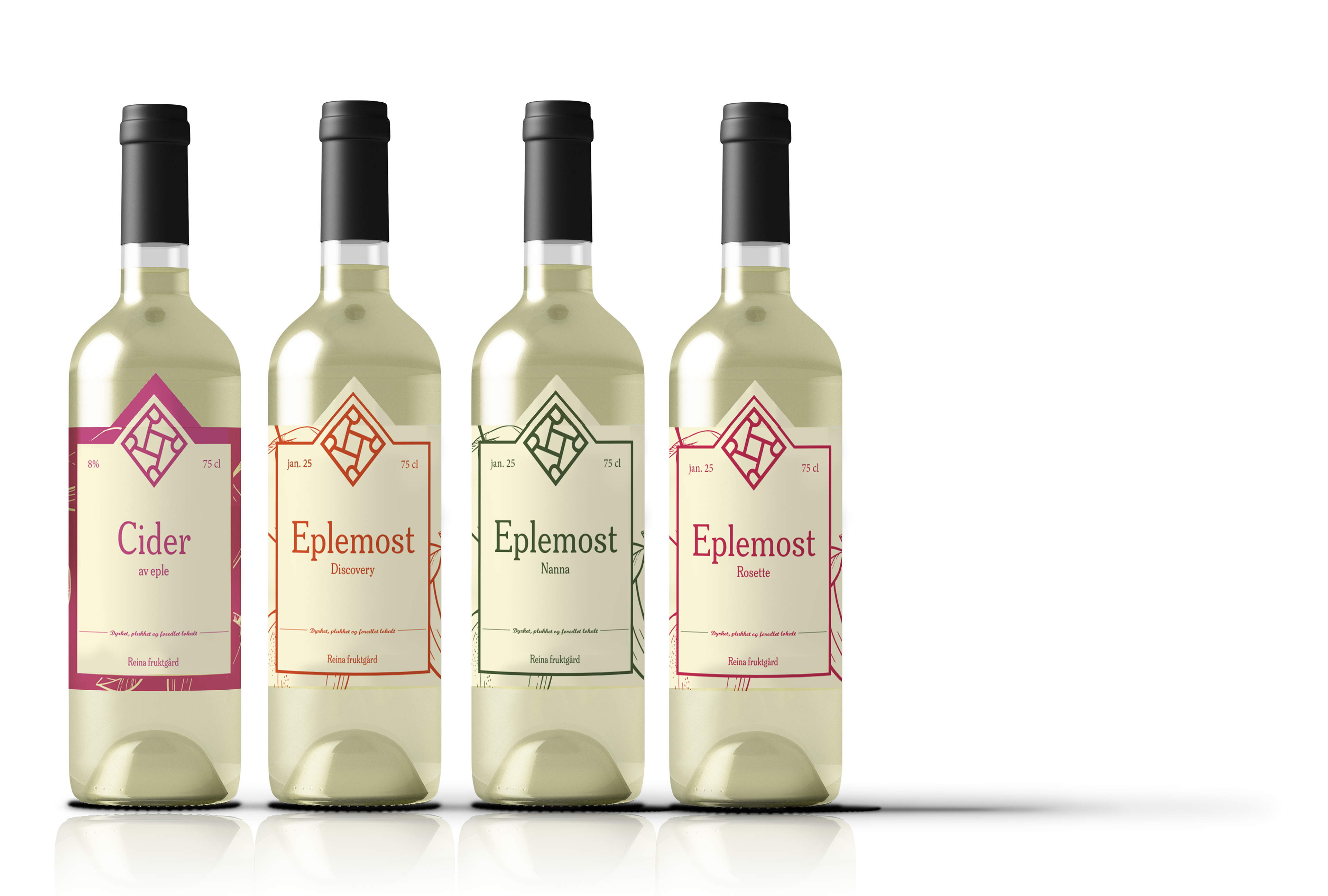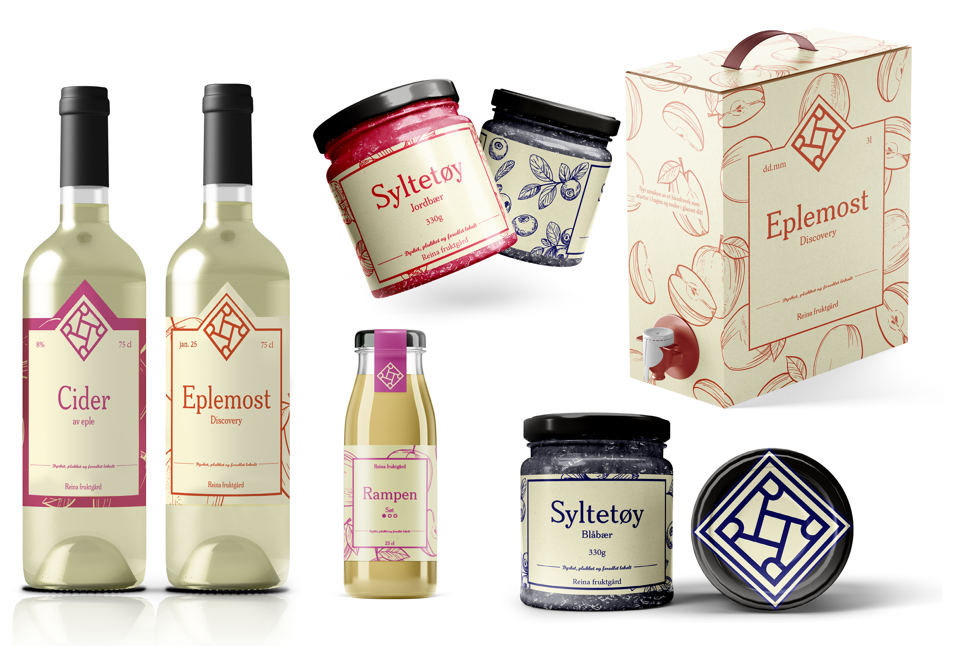 Her presenteres ferdig design for både eksisterende og nye produkter for Reina Fruktgård. Designet er implementert på eplemost (3l og 0,75l), cider (0,75l), alkoholfri shot (0,25l) og syltetøy (330g). Løsningen er utviklet med utgangspunkt i innsikt fra researcharbeidet, der strategiske mål, konkurrentbilde og salgskontekst har vært førende for de visuelle valgene.