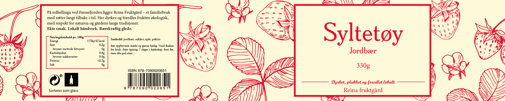 Syltetøyet er foreløpig det eneste produktet uten epleillustrasjoner og benytter derfor også et eget fargeuttrykk som viser til hovedingrediensen. Her er logoen plassert på lokket, grunnet det samme funksjonelle hensynnet.