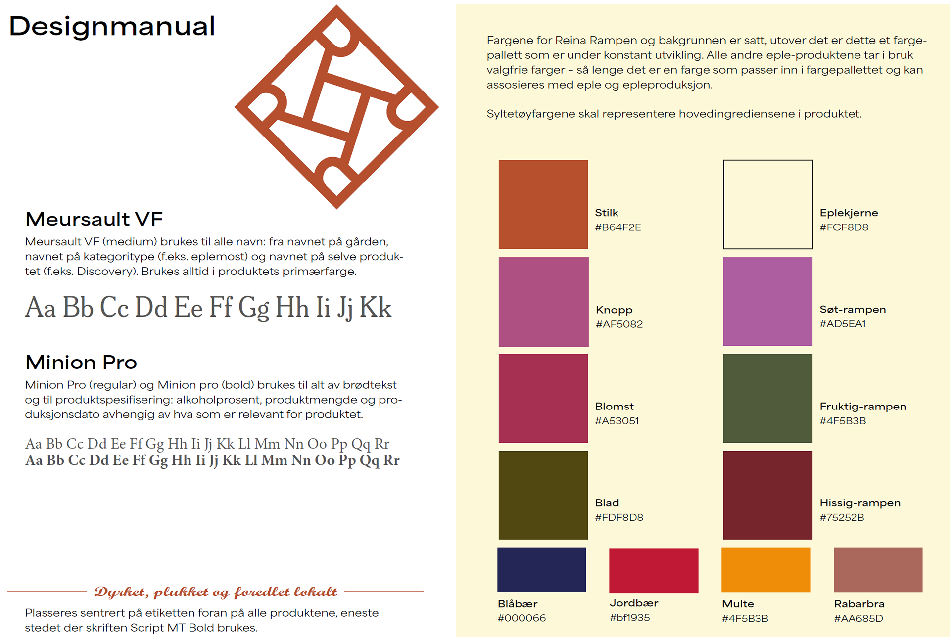 Den visuelle identiteten er bygget opp rundt en konsekvent duo-fargepalett, der basisfargen «Eplekjerne» alltid er til stede, mens sekundærfargen varierer etter produkt og smak. Dette gir tydelig gjenkjennelse samtidig som hvert produkt får sin egen karakter. Som et gjennomgående grafisk element er hovedingrediensen illustrert og brukt som mønster rundt etiketten, sammen med logoen som et tydelig formelement på tvers av sortimentet.